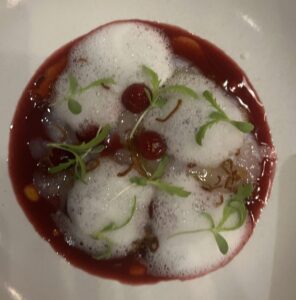 We decided to splurge a little and went for the smaller version of the ‘Bouquet of Wildflowers’ tasting menu. Not only were all the dishes excellent, it turned out to be more than enough food for the two of us. There were five courses for us to share and the beautifully presented dishes were varied. My favorite were the scallop crudo and the black truffle tart (literally covered with black truffle!). The restaurant was also very flexible in listening to our preference for types of food we like. My husband requested the Wagyu tri-tip as one of our dishes and it was our main course. The steak was cooked to medium rare, and it was tender and very flavorful.